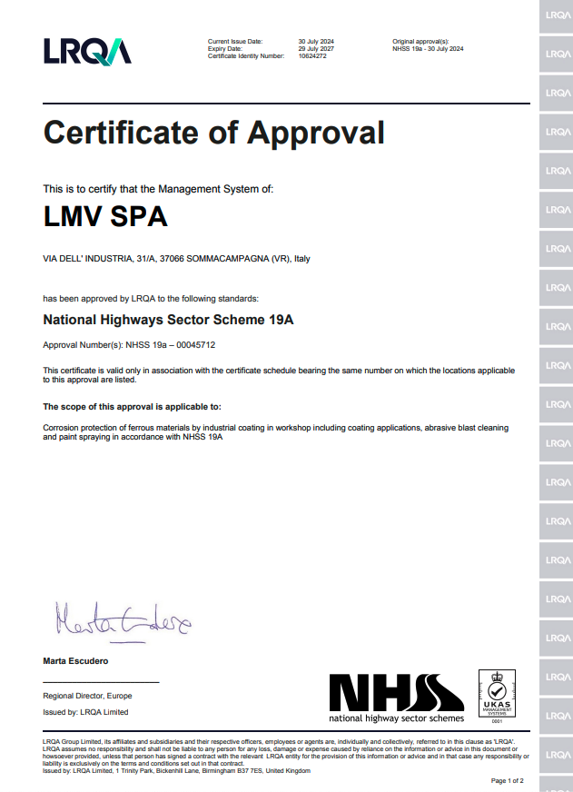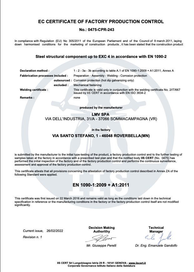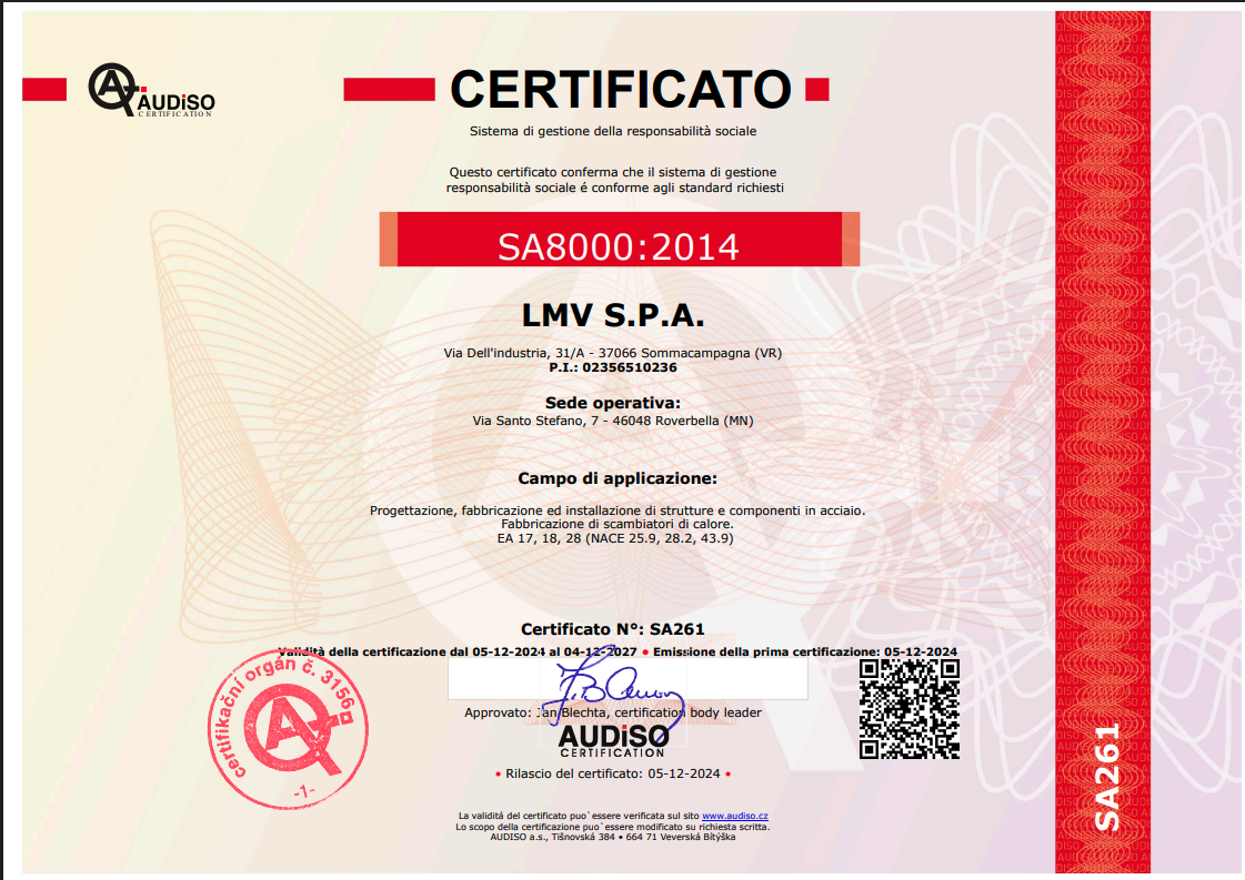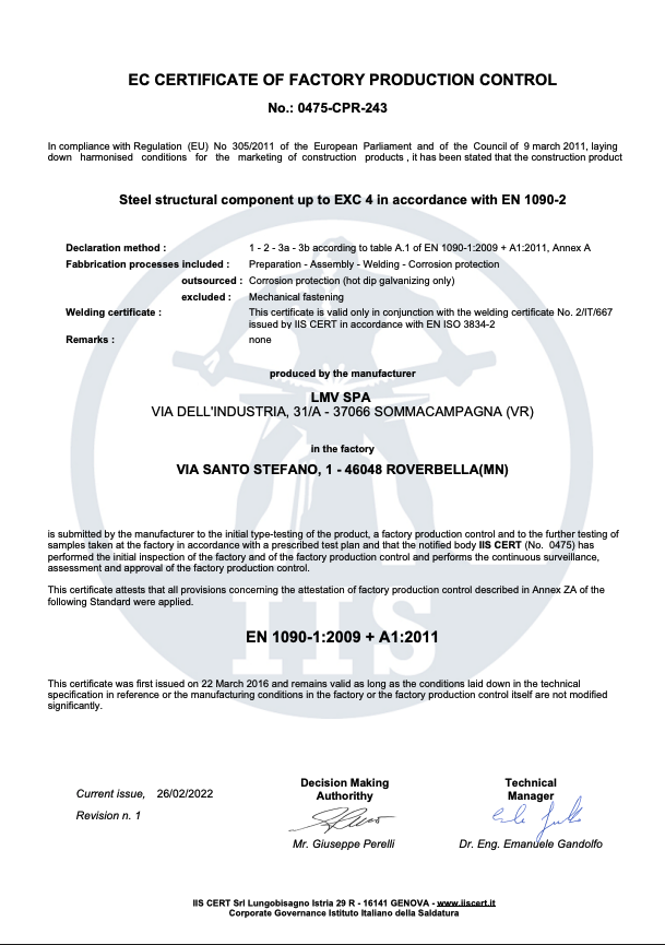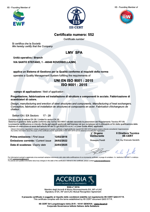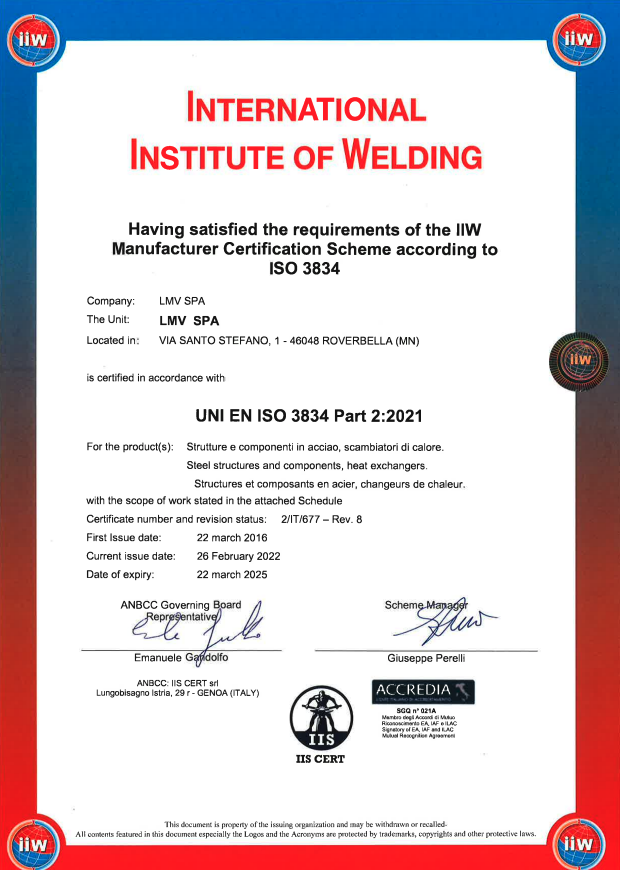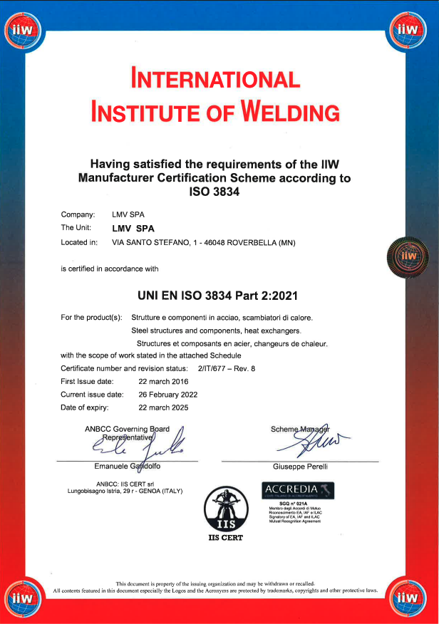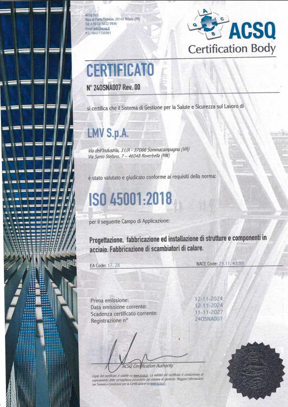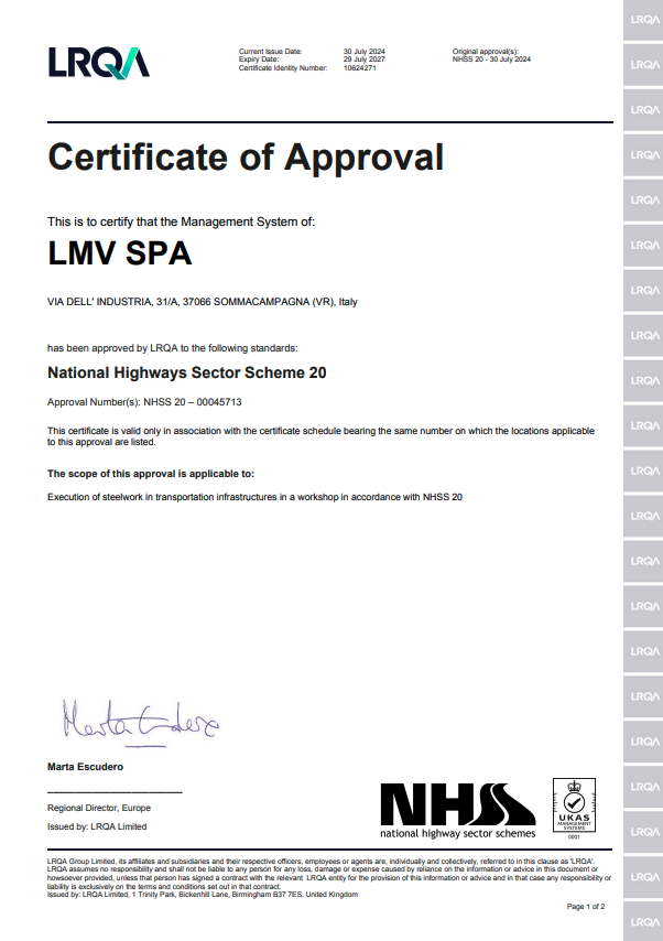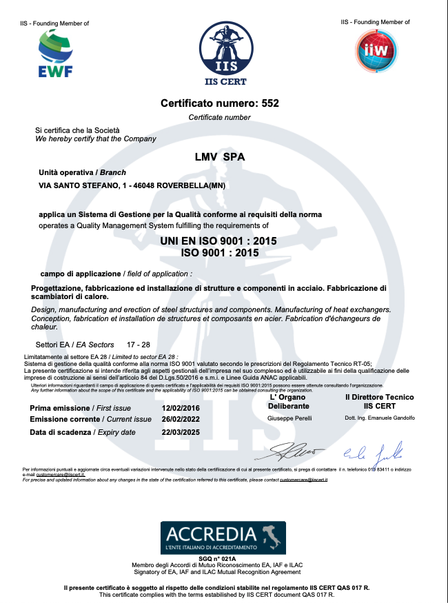 La richiesta di un livello qualitativo sempre più alto nel settore e le normative sempre più esigenti in tal senso hanno portato l’azienda ad accrescere nel tempo le proprie qualificazioni tecniche, il personale addetto ai controlli in produzione e presso i propri sub fornitori e il loro grado di formazione. L’azienda è certificata per il proprio sistema qualità secondo UNI EN ISO 9001:08, per il proprio processo di saldatura secondo EN ISO 3834-2 ed è accreditata come Centro di Trasformazione presso il Consiglio Superiore dei Lavori Pubblici. Dal 2013 ha inoltre certificato il proprio controllo della produzione in fabbrica secondo la normativa EN 1090 che permetterà di marcare CE le strutture fornite come previsto per legge a partire dal 01/07/2014. LMV S.p.A. effettua costantemente controlli sui materiali base, tramite laboratori con adeguata autorizzazione ministeriale, quali prove meccaniche di trazione e di resilienza fino a -50°C, analisi chimiche e prove di durezza.