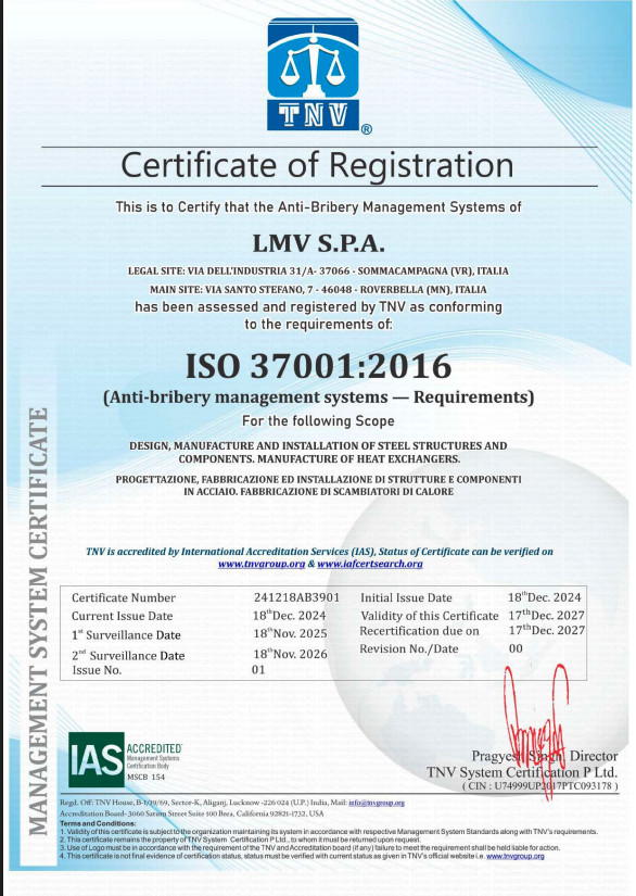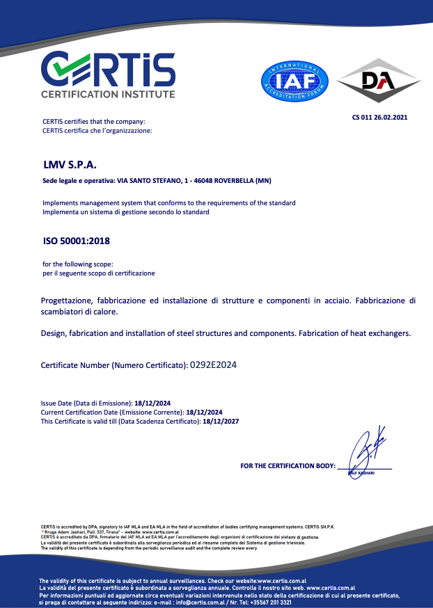 Con l'acquisto dell'ultima generazione di macchine Adige Sys e Ficep, LMV ha implementato le proprie attività di preprocessing, automatizzazione e processi eseguiti manualmente. Ora LMV fa il taglio e il taglio al plasma di qualsiasi tipo, taglio e trapano laser di tubi per sezione quadrata e rettangolare e doppio profilo T. La capacità produttiva è notevolmente aumentata grazie alla riduzione dei tempi di precaricamento delle lastre e dei profili. LMV ha ottenuto un attestato PED per la produzione di apparecchiature a pressione e scambiatori di calore.