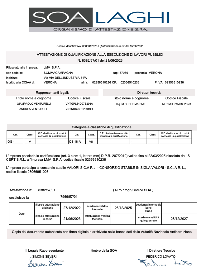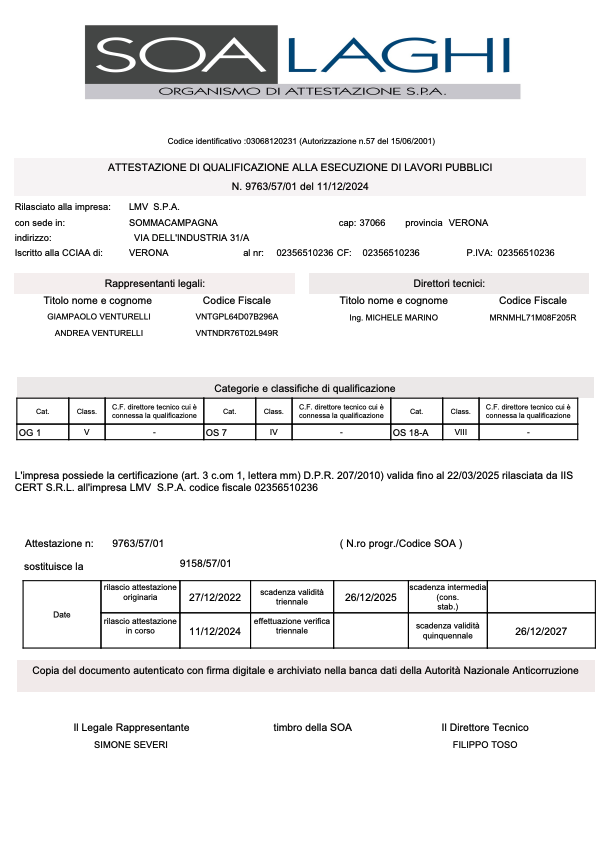 Tutti questi controlli sono estesi, quando previsto, anche ai cantieri che sono sotto il diretto controllo o la supervisione di LMV S.p.A. e nei quali è sempre presente un nostro capo cantiere per la gestione, il coordinamento e il controllo di tutte le fasi di montaggio. Tutto il materiale fornito da LMV S.p.A. è corredato dai certificati del materiale fornito e da tutti i certificati di controllo previsti in fase di ordine e secondo le normative vigenti.
